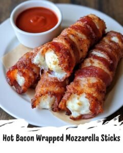 This recipe is special because it combines two popular foods into one simple dish. Bacon adds a smoky and salty taste that makes the mozzarella sticks even more delicious. When the bacon cooks, it becomes crispy and forms a tasty outer layer. Inside that crispy layer is soft melted cheese that stretches when you pull it apart.