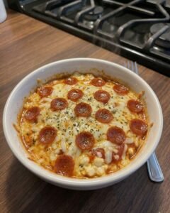 The taste is also very comforting. The melted mozzarella and marinara sauce create the familiar flavor of pizza. The pepperoni adds a savory bite that makes the dish exciting. Even though it is a small bowl, it feels very satisfying.
