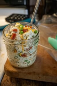 Serve the bowl warm. Mix slightly before eating so the ranch, chicken, bacon, and vegetables combine beautifully.