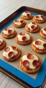 Divide the chicken mixture into six equal portions. Place each portion on the baking tray and flatten it gently with your fingers or the back of a spoon. Try to create small round shapes that look like mini pizza bases. The thickness should be about one centimeter so the crust cooks evenly.