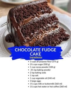 The chocolate fudge cake is a dessert that has won the hearts of many people all over the world because it offers a deep and rich experience that few other sweets can match. This recipe is all about creating a cake that is very soft and moist while also being packed with a very strong chocolate flavor that stays on your tongue long after the last bite. When you think of a classic cake that everyone enjoys, this specific fudge version is usually the first thing that comes to mind because it combines the airy feel of a sponge with the thick and creamy texture of a candy bar. Most people find that making a cake from scratch can feel a bit scary at first, but this recipe is designed to be simple and easy for anyone to follow even if they have never baked before in their life. By using basic pantry items like flour and sugar along with high quality cocoa powder, you can transform a few simple ingredients into a masterpiece that looks like it came straight from a professional bakery window. We are going to focus on the magic of mixing these items in the right way to ensure that the cake never turns out dry or crumbly but instead remains dense and fudgy.