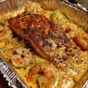 Creamy garlic butter shrimp and seared salmon is a meal that brings comfort, flavor, and elegance to the table. It combines simple cooking techniques with rich ingredients that naturally complement each other. The creamy sauce, tender shrimp, and perfectly cooked salmon create a dish that feels satisfying and special without requiring complicated preparation.