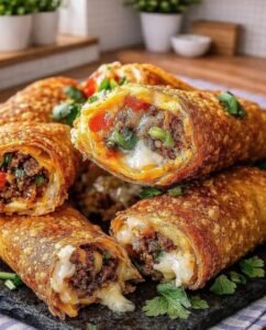 People love this recipe because it gives comfort, joy, and a feeling of homemade happiness. The crispy sound when you bite into the egg roll is very satisfying. The cheese melts beautifully and mixes with the beef to create a rich and creamy taste. These egg rolls are great for sharing with family and friends. They are popular with kids and adults because the flavors are familiar and loved by many people around the world. Every bite feels warm, filling, and enjoyable.