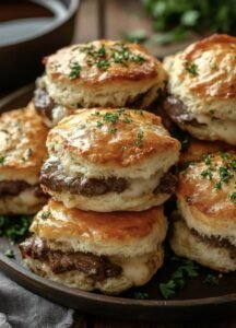 French Dip Biscuits Recipe is a warm and comforting dish that brings together soft biscuits, tender beef, melted cheese, and rich dipping sauce. This recipe is inspired by the classic French dip sandwich, but it is made in a fun and simple way using fluffy biscuits instead of long bread rolls. The biscuits are filled with thin slices of roast beef and creamy cheese, then baked until golden and delicious. After baking, they are served with a warm beef sauce for dipping. Each bite is soft on the outside and full of savory flavor on the inside. This recipe is perfect for people who love easy meals that still taste special and homemade.
