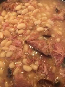 After two hours take a spoon and test a few beans to see if they are tender. If they are soft and creamy you can remove the ham bone from the pot. Cut any remaining meat off the bone and shred it into small pieces before adding it back into the stew.