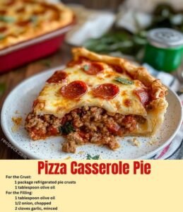 The Hearty Pizza Casserole Pie is a wonderful fusion of two of the most beloved comfort foods in the entire world because it combines the cheesy goodness of a fresh pizza with the deep and satisfying layers of a traditional baked casserole. This dish is designed to bring families together around the dinner table while offering a creative twist on the standard round pizza crust that everyone is used to eating every weekend. Instead of a flat dough base that can sometimes get soggy or thin, this recipe uses a clever layering technique that ensures every single bite is packed with savory meat and gooey melted cheese along with perfectly cooked pasta or crust elements. Many home cooks find this recipe to be a total lifesaver because it simplifies the pizza making process by removing the need for stretching dough or dealing with a hot pizza stone while still delivering those classic Italian flavors that we all crave constantly. You can think of it as a deep dish pizza that has been transformed into a warm and bubbly hug in a baking dish which makes it the ultimate crowd pleaser for kids and adults alike who want something substantial and delicious.