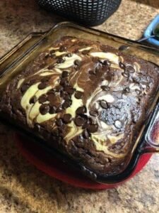Pour the dark chocolate brownie batter into your prepared baking pan and spread it out evenly with your spatula. Then take the white cheesecake mixture and drop big spoonfuls of it on top of the chocolate batter. Use a knife or a toothpick to gently swirl the two colors together to create a pretty marble pattern on the top.