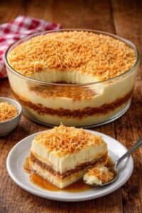 This dessert is perfect for many occasions. You can make it after dinner when you want something sweet but not too heavy. It is also great for people who exercise and want a protein rich treat after a workout. Some people even prepare it for weekend gatherings, birthdays, or small celebrations at home. The creamy layers and caramel taste make people smile with the first bite. If you love coconut and smooth desserts, this recipe can quickly become one of your favorite homemade treats.