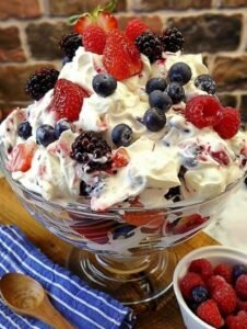 The mixed berry whipped cream salad is a delightful treat that brings together the best flavors of nature and the light texture of a fluffy dessert. This dish is basically a bowl full of fresh fruits like strawberries and blueberries mixed with a thick and sweet cream that feels like eating a cloud. It is not exactly a leafy green salad like you might have for lunch but instead it is a sweet side dish or a dessert that everyone at the table will reach for first. When you see it in a glass bowl you will notice the bright reds and deep blues of the berries popping against the pure white background of the whipped cream which makes it look very fancy even though it is very easy to make. This recipe is all about celebrating the simple joy of fresh produce while adding just enough sweetness to make it feel like a special treat for your family and friends. Many people call this a fluff salad because it is so light and airy that it almost melts in your mouth as soon as you take a spoonful of it. It is a wonderful way to use up a lot of berries during the warm months when they are at their peak of ripeness and taste the sweetest. Because it is so simple you do not need to be an expert cook to get it right every single time you decide to whip it up in your kitchen.