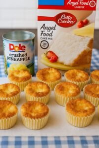 Here are the simple ingredients needed for this pineapple angel food cupcakes recipe. The quantities below make about 12 cupcakes.