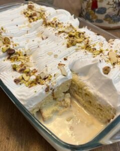 This dessert is also visually beautiful. The light cream topping with green pistachio pieces creates an elegant look that makes the cake perfect for parties and celebrations.