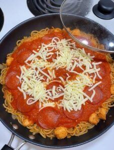Many people fall in love with this recipe the first time they try it. It has the same comforting taste that reminds you of your favorite pizza night. The difference is that it is made in one skillet with simple ingredients. You do not need to knead dough or wait for anything to bake in the oven for a long time. The noodles soak up the marinara sauce and the cheese melts beautifully on top. When the pepperoni warms up and releases its flavor, the entire dish smells like fresh pizza. This is why people say they made pizza without dough and suddenly they cannot stop making it again and again.