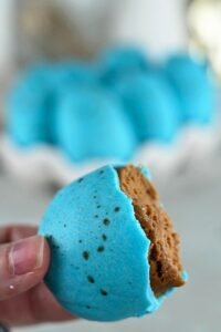 Place all of your shaped eggs onto the parchment paper and put the tray into the freezer for at least thirty minutes. You want the peanut butter centers to be very cold and firm so that the chocolate coating stays on easily and does not melt the dough.