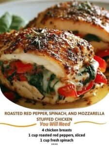 Roasted red pepper, spinach, and mozzarella stuffed chicken is a wonderful recipe that combines simplicity with elegance. The ingredients are easy to find, the preparation is simple, and the result is a meal that looks beautiful and tastes amazing. The colorful filling inside the chicken creates a dish that feels special while still being easy enough for everyday cooking.
