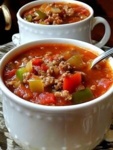 Another reason this recipe stands out is its balanced ingredients. The bell peppers provide natural sweetness and important vitamins. Ground beef gives protein that helps keep you full and energized. Rice adds gentle texture and makes the soup satisfying for a full meal.